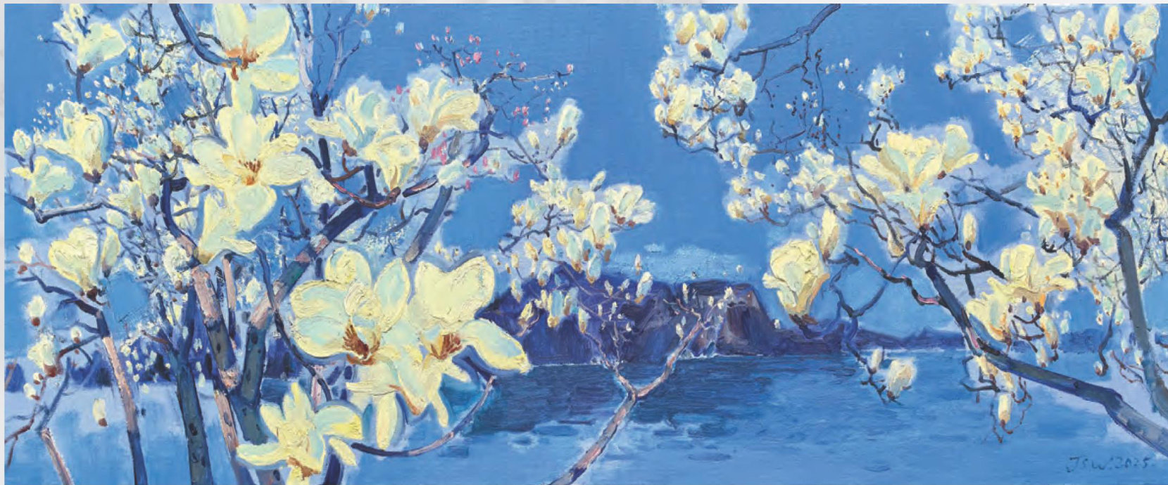 《玉之兰》 60× 150厘米亚麻布油彩 王景生的字典里没有停歇二字°他深知绘画艺术的高峰看不到顶’他的心已沉静下来, 没有什么理由能阻碍他放下心爱的画笔° 人生是一场旅行,最好的风景在路上,求索之路永远没有尽头,抱一至永,乐在其中,就是这样一位画家。 八十年代初,景生还是一个毛头小子,他以优异的成绩考入师范学校,并留校任教,后数度深造。他用色彩去勾画属于他的精神世界,任岁月流逝,华发染