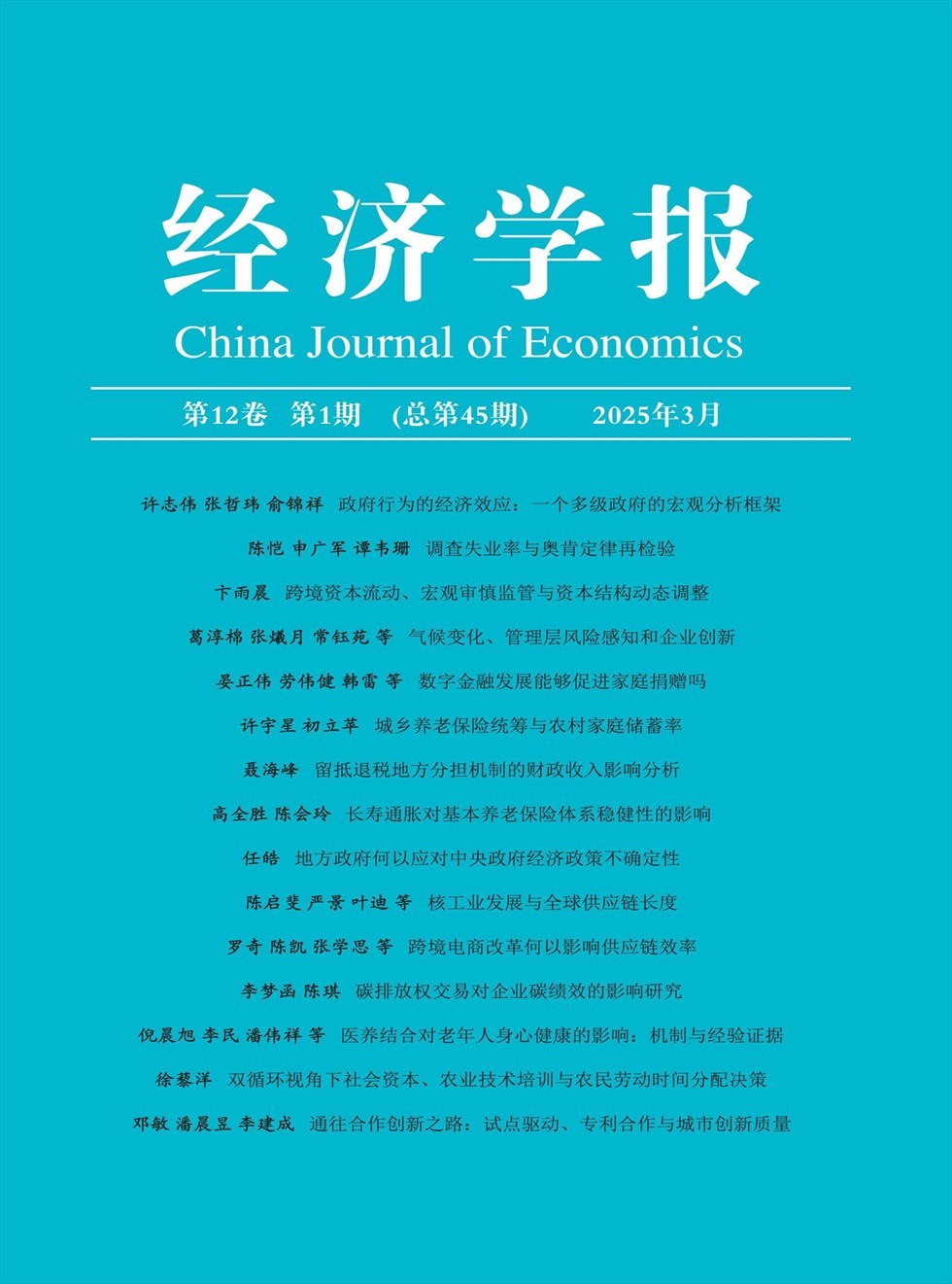 《经济学报》(英文名称China Journal of Economics, 缩写是CJE)是教育部主管、清华大学主办的经济学科学术性期刊。《经济学报》由清华大学出版社出版,每年出版四期,国内公开发行刊号为CN10-1175/F,于2014年3月正式创刊并出版发行。 《经济学报》涵盖经济学科的所有学科领域,发表原创性的学术研究成果以及综述和评论性的研究论文。本刊秉承学术、公正的原则,倡导独立、客观的研究,提倡严谨、规范的方法。